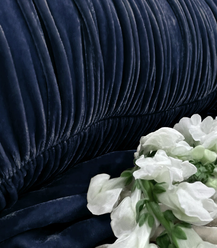 Features silk blend small -batch dyed silk velvet, gathered fully on both sides , zips closed. and filled with our premium hypoallergenic down fill is soft and animal-free.